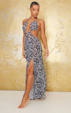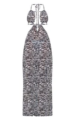 Robe de plage longue effet lin noir et blanc imprimé zèbre à dos nu et découpes