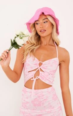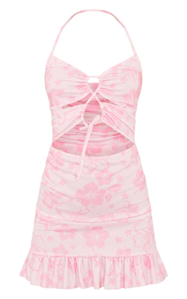 Robe droite dos nu fleurie rose à ourlet volanté et découpes