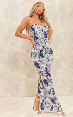 Robe longue bleue imprimé Renaissance tissée stretch à boutons et bretelles
