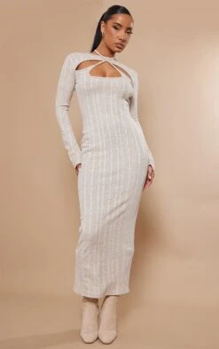 Robe longue côtelée avoine découpée à nouer dans le cou