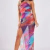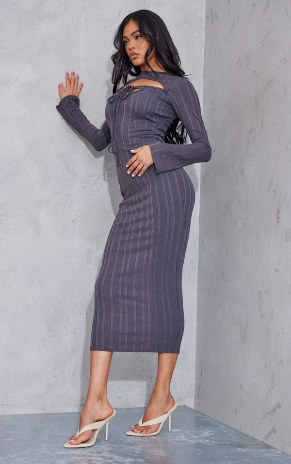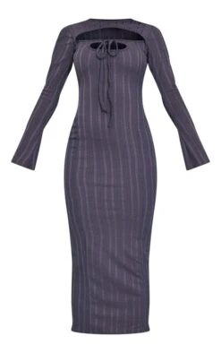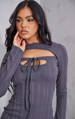 Robe longue côtelée gris anthracite découpée à nouer dans le cou