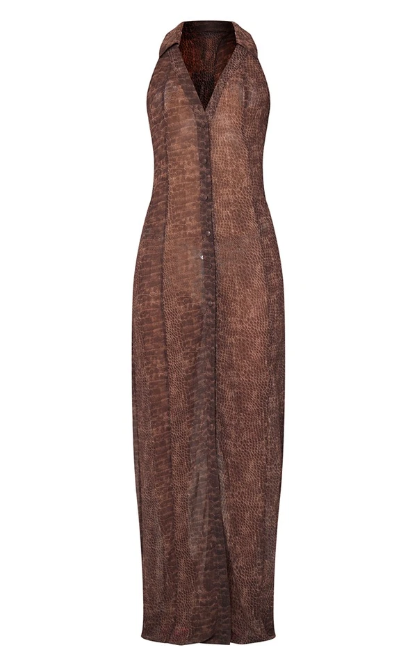 Totalement fans de cette robe Ă la coupe longue. On aime sa matière en mousseline de soie de couleur chocolat et son imprimĂ© croco stylĂ© que l’on porte avec une paire de talons hauts et quelques accessoires. Vous allez faire sensation.