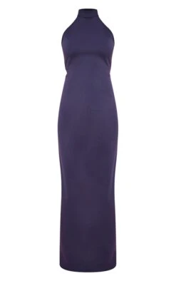 Robe longue en néoprène bleu marine à col montant croisée dans le dos
