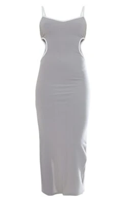 Robe longue grise côtelée texturée à découpes et liserés contrastants
