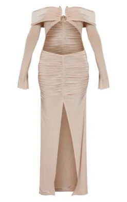 Robe longue moulante découpée gris pierre à col bardot et empiècement