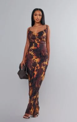 Impossible de se louper dans cette robe à la coupe longue ! Sa matière plissée est super canon et on adore son coloris marron, son imprimé dégradé arty et ses bretelles fines super délicates. On enfile une paire de talons hauts et quelques bijoux gold. C’est si beau !