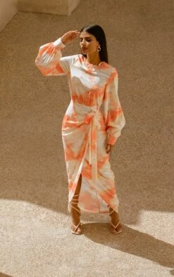 Robe longue portefeuille nouée orange imprimé aquarelle à franges