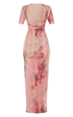 Robe longue rose en mesh javélisé à manches courtes et encolure ronde