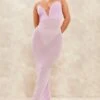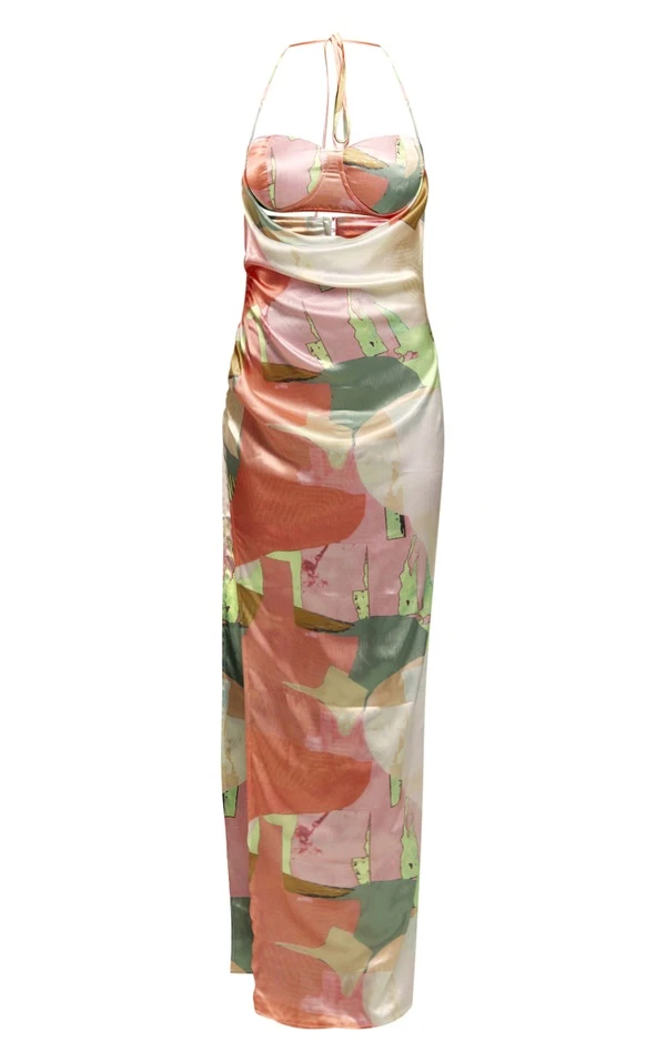Robe longue satinée drapée rose imprimé abstrait à découpes