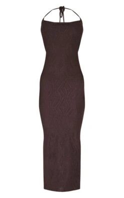 Robe longue texturée marron chocolat nouée au dos à col bénitier et derrière froncé