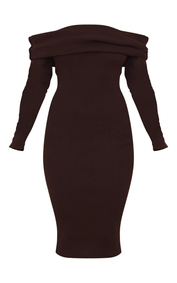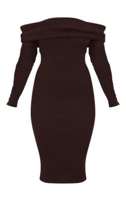 Robe mi-longue chocolat en maille tricot Ă col bardot