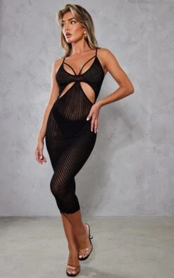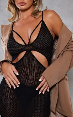 Cette robe est juste must-have ! Avec sa couleur noire, sa transparence, sa maille pointelle et ses parties tricotées présentant différents designs, elle est parfaite pour les babes qui aiment jouer sur les matières. On vous conseille de porter ce genre de robe avec des mules à talon piédestal transparentes. Un coup de coeur absolu !