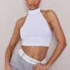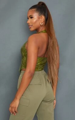 Top dos nu en similicuir vert olive délavé à décolleté et laçage