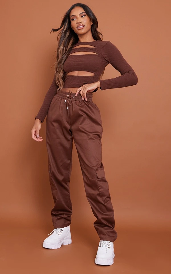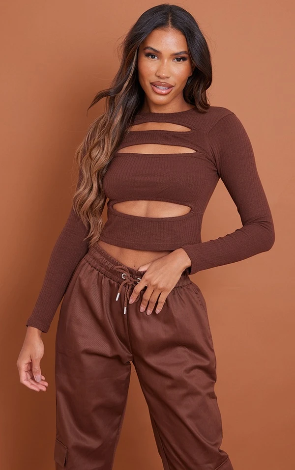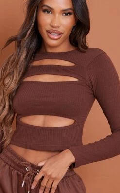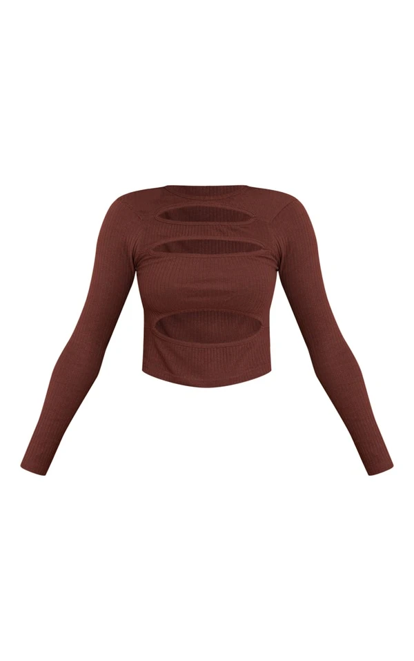 Top chocolat très côtelé à manches longues et découpes